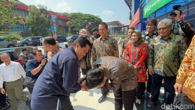 Erick tampak menyalami Budi Arie. Selanjutnya Erick menyalami Gibran, yang berdiri di belakang Budi Arie. Tampak Gibran membungkuk saat bersalaman dengan Erick.