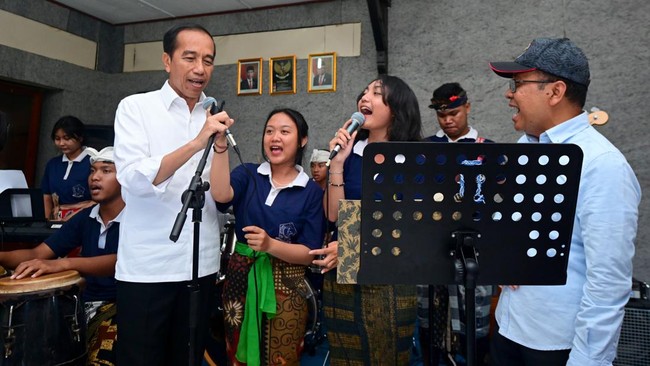 Jokowi juga sempat ikut bernyanyi lagu dari grup musik Slank yang berjudul 'Ku Tak Bisa', yang sedang dibawakan oleh para pelajar di studio musik. Dalam foto yang diterima detikcom, Jokowi tampak bernyanyi bersama para siswi SMKN dan Mensesneg Pratikno.