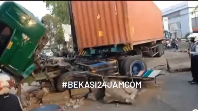 Dalam video yang dilihat detikcom, Rabu (1/11/2023), tampak kontainer tersebut melintang di jalan. Bagian depan kontainer tampak rusak parah.