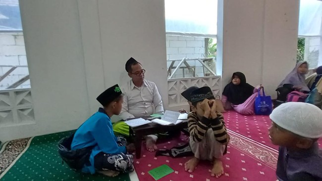 "Habis salat asar saya mengajar anak-anak membaca huruf hijaiyah dan hafalan surat pendek serta doa sehari-hari. Setelah anak-anak selesai giliran ibu-ibu yang belajar mengaji hingga menjelang magrib," ungkapnya.