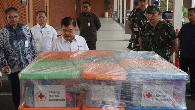"Ya bantuan dari PMI alat-alat kebersihan, dan juga perlengkapan-perlengkapan untuk perempuan, anak-anak begitu," ujar JK.