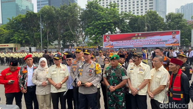 Polda Metro Jaya melakukan apel pengamanan swakarsa dalam rangka pengamanan Pemilu 2024. Organisasi kemasyarakatan (ormas) hingga satpam dilibatkan dalam pengamanan.
