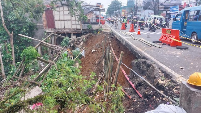 Pantauan detikcom di lokasi pada siang hari, tampak tebing longsor di Jl Raya Tajur, Kota Bogor. Material longsor berupa tanah, rangka bangunan, hingga batang pohon tampak memenuhi aliran Sungai Cibalok di bawah tebing.