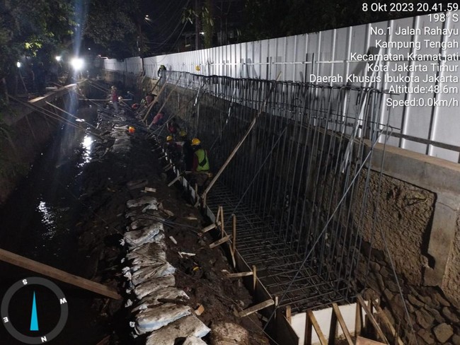 Pekerja masih berusaha membangun tanggul di Kali Baru Timur, Kramat Jati, yang sering meluap sampai area pertigaan Hek di Jl Raya Bogor. Kini musim hujan sudah tiba, Kali Baru sudah sempat meluap di kawasan Jakarta Timur itu.