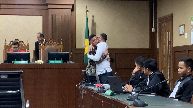Pantauan detikcom, usai persidangan, Mario Dandy terlihat menghampiri Rafael Alun. Mario Dandy tampak mencium tangan dan memeluk Rafael Alun.