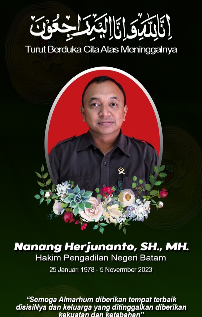 Seorang hakim Pengadilan Negeri (PN) Batam ditemukan tewas di dalam sebuah kamar hotel di Kota Batam, Kepulauan Riau (Kepri). Di dekat jasad Hakim PN Batam bernama Nanang Herjunanto itu ditemukan sejumlah obat-obatan.