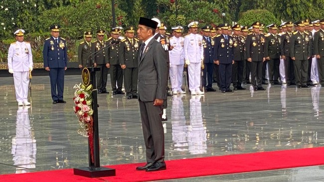 "Untuk mengenang jasa para pahlawan dan pejuang-pejuang bangsa, mengheningkan cipta dimulai," kata Jokowi.