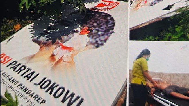 Baliho Partai Solidaritas Indonesia (PSI) roboh di Jalan Srikandi Nomor 4, Semarapura, Klungkung, Bali. Baliho berukuran 3x2 meter itu menimpa pengendara motor, I Wayan Sumendra (45), hingga terluka.