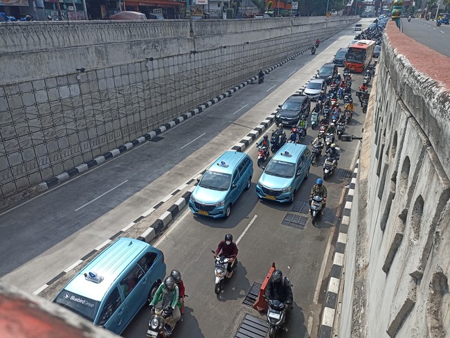 Pengendara juga harus mengurangi laju kendaraannya. Hal itu menyebabkan antrean kendaraan mengular.