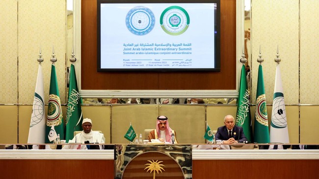 Presiden Joko Widodo (Jokowi) menghadiri KTT OKI di Riyadh, Arab Saudi. Salah satu hasil KTT OKI tersebut adalah permintaan gencatan senjata Israel di Gaza, Palestina.