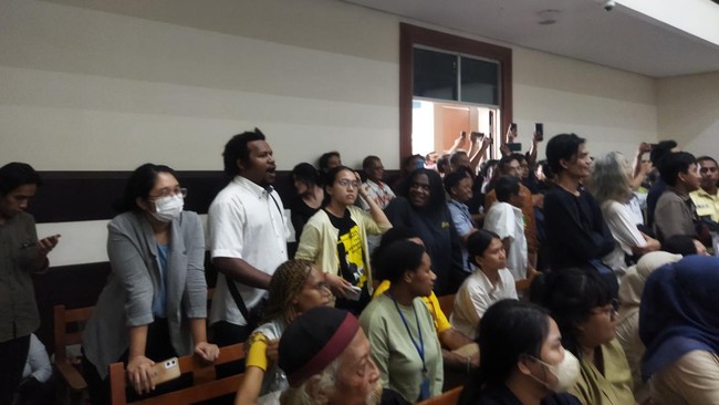 Pengunjung sidang terus berteriak hingga bertepuk tangan di ruang sidang. Hakim meminta pengunjung sidang tertib.