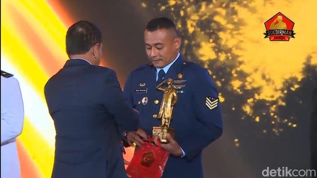 Penghargaan Tentara Berdedikasi TNI AU ini dibacakan oleh host. Sementara trofi untuk Serka Meldi diserahkan oleh Wamenhan Jenderal (Purn) Muhammad Herindra.