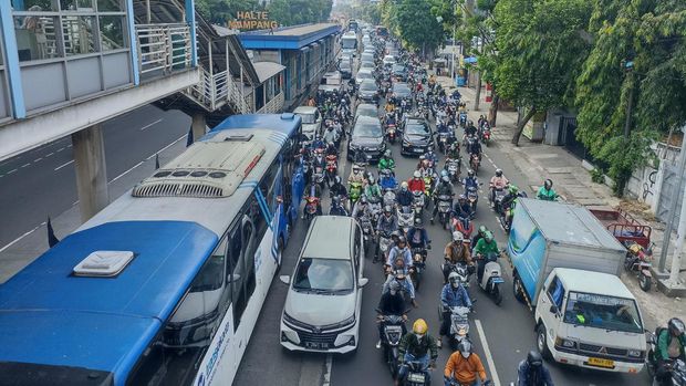 Kemacetan imbas tutup got underpass Mampang rusak, mobil dan motor terobos jalur TransJ (busway) (Foto: Wildan Noviansah/detikcom) |