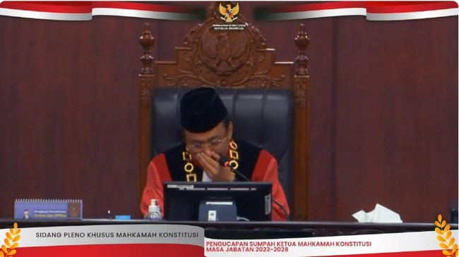 Suhartoyo resmi menjadi Ketua Mahkamah Konstitusi (MK). Tangis Suhartoyo pecah saat mengajak Hakim MK membangun kembali kebersamaan.