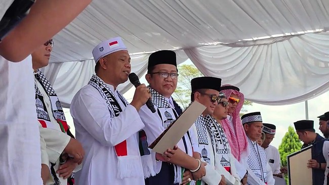 "Saudara Islam kita digenosida, diinjak, dianiaya di luar perikemanusiaan. Maka wajib bagi kita untuk bangkit berdoa, bersatu membantu Israel, Allahuakbar. Palestina merdeka, Palestina merdeka, Israel hancurkan," orasi Bupati Tasikmalaya Ade Sugianto yang viral melalui media sosial.