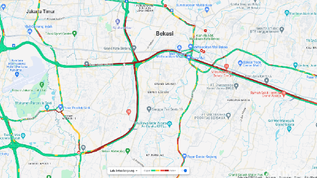 Dilihat dari Google Maps, kemacetan di Tol Jakarta-Cikampek mengarah ke Cikampek terjadi dari Km 6 dengan indikator warna merah yang menunjukkan kecepatan lalu lintas di lokasi pelan.