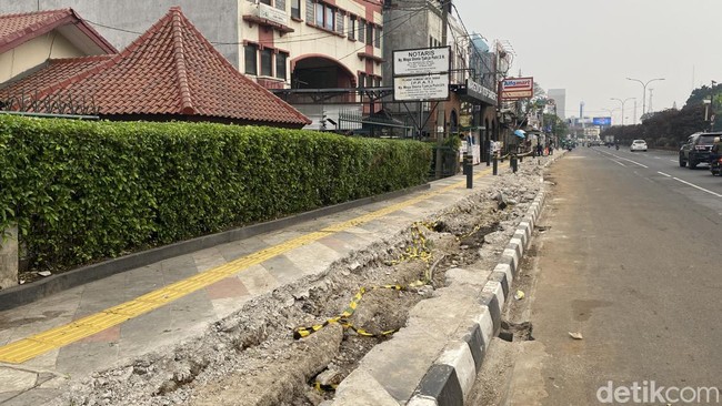 Pantauan detikcom di Jalan Margonda Raya, Depok, Jawa Barat, Kamis (23/11/2023), tepatnya di antara Ciplaz Depok dan Polres Metro Depok, trotoar itu dibongkar. Tampak bongkaran itu tepat di depan kantor Notaris sepanjang 10 meter.