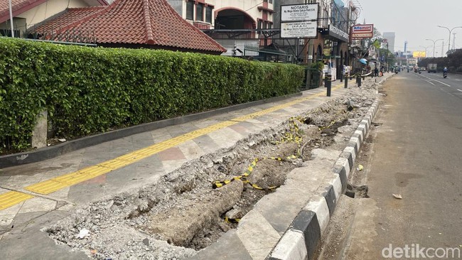 Bongkaran itu tampak sedalam 50 cm. Bongkaran itu mengambil setengah jalur trotoar untuk pejalan kaki. Pada pukul 14.54 WIB tak tampak aktivitas pengerjaan di lokasi.