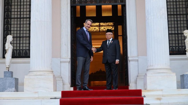 Ma'ruf tiba di Maximos Mansion dan disambut langsung Mitsotakis, Jumat (24/11/2023). Ma'ruf dan Mitsotakis kemudian berjalan menuju lokasi pertemuan di Ministerial Room.