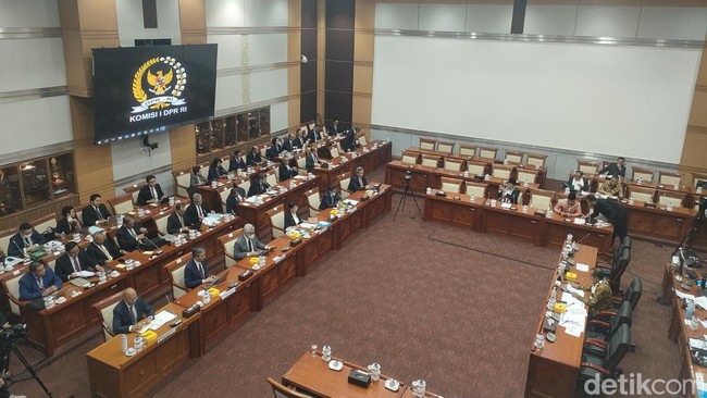 Pantauan detikcom di ruang Komisi I DPR RI, Nusantara II, Senayan, Jakarta, rapat dipimpin langsung oleh Wakil Ketua Komisi I Abdul Kharis Almasyhari pada pukul 13.15 WIB. Hadir di sana Menteri Luar Negeri (Menlu) Retno Marsudi hingga Wamenlu Pahala Mansury.