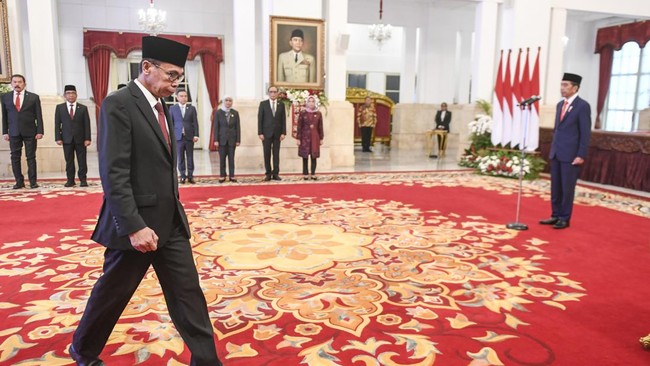 Nawawi mengucapkan sumpah dan janji di depan Jokowi. Pembacaan sumpah itu digelar di Istana Negara, Jakarta, Senin (27/11/2023).