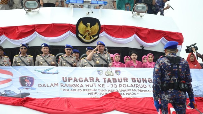 Badan Pemelihara Keamanan (Baharkam) Polri menggelar tabur bunga di laut perairan Teluk Jakarta, Selasa (28/11) pagi. Kegiatan tersebut dalam rangka HUT ke-73 Polairud.