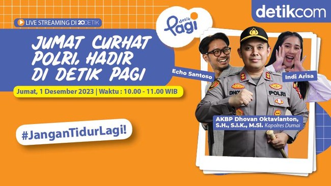 Episode ke-15 Jumat Curhat di detikPagi akan tayang pada Jumat (1/12/2023). Dipandu host Echo Santoso dan Indi Arisa, Kombes Dhovan akan tampil live di detikPagi menceritakan berbagai program kerjanya untuk menjaga kamtibmas di Kota Dumai tetap kondusif.