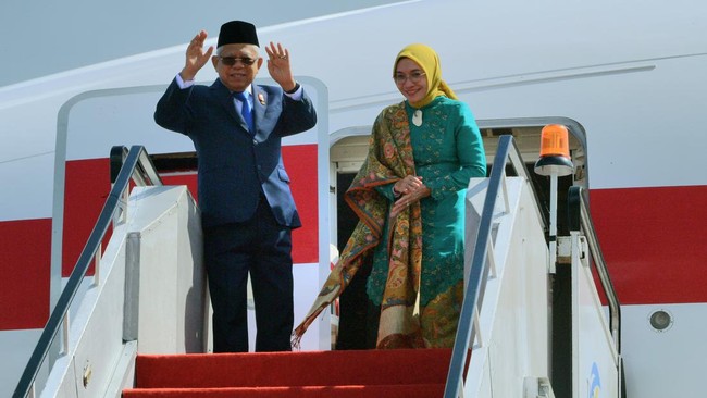 Wakil Presiden Ma'ruf Amin dan istri, Wury Ma'ruf Amin, tiba di Tanah Air setelah melakukan kunjungan kerja ke tiga negara. Ma'ruf kembali ke Indonesia setelah menempuh penerbangan selama 1 jam dari Kuching, Malaysia.