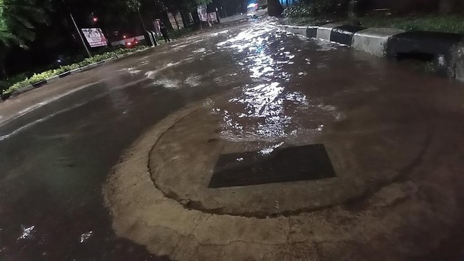 Hujan deras mengguyur Jakarta malam ini. Jalan Adiaksa Raya di Lebak Bulus, Jakarta, tergenang.
