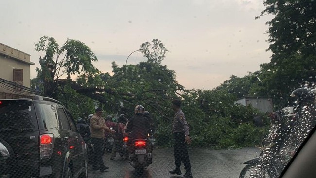 Dari postingan foto di akun TMC Polda Metro, terlihat pohon yang tumbang cukup rimbun. Ranting pohon yang bercabang menutupi akses jalan.