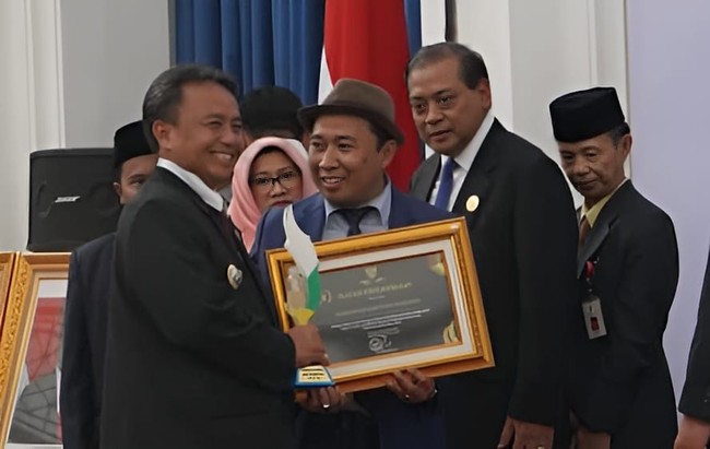 Penghargaan diberikan langsung oleh Ketua Komisi Informasi Jawa Barat Ijang Faisal kepada Pj Bupati Sumedang Herman Suryatman di Gedung Sate, Bandung, Kamis (30/11/2023).