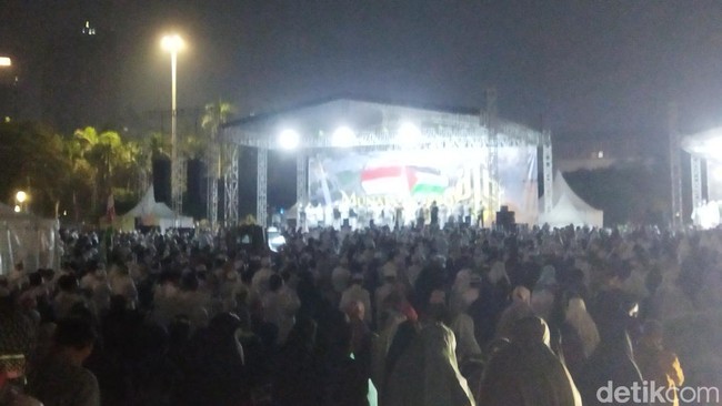 Sebelumnya, massa aksi juga sempat melaksanakan salat tahajud secara berjamaah tepat pukul 03.00 WIB. Massa pun berkumpul membuat shaf tepat di depan dua panggung yang terpasang.