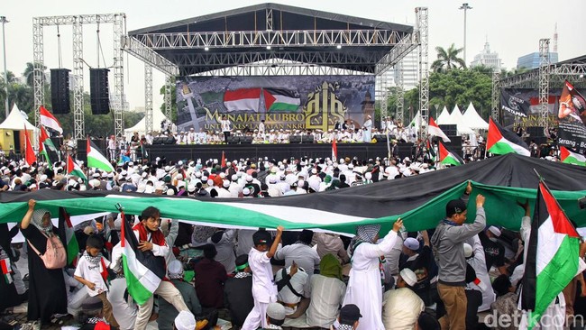Dan melalui sambutan saya juga, saya bersama umat memohon dengan sangat hormat kepada Bapak Presiden RI dan jajaran Polhukam RI, termasuk TNI dan Polri serta Kejaksaan RI, agar segera menindak tegas siapa pun dari kelompok mana pun di NKRI yang secara vulgar membela zionis Israel atau dengan sengaja mengibarkan bendera zionis Israel atau membangun museum holocaust Israel atau mendirikan arau menyerang umat yang sedang aksi damai bela Palestina," kata Habib Rizieq Shihab.