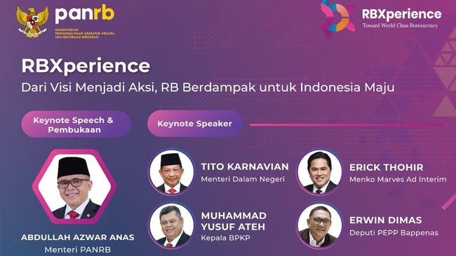 Kementerian Pendayagunaan Aparatur Negara dan Reformasi Birokrasi (PANRB) akan menggelar RBXperience. Ini adalah ajang bagi instansi pemerintah untuk saling belajar serta bertukar pengetahuan dan pengalaman terkait implementasi kebijakan reformasi.