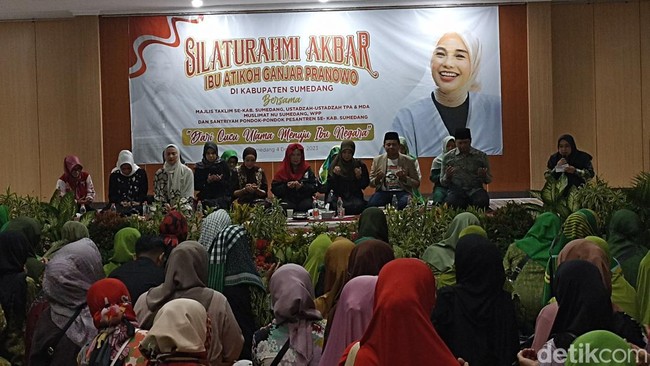 Istri capres nomor urut 3 Ganjar Pranowo, Siti Atikoh, melanjutkan kunjungan ke Kabupaten Sumedang, Jawa Barat. Kali ini, Atikoh bertemu dengan majelis taklim se-Kabupaten Sumedang.