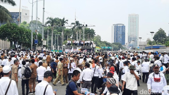 Massa demo dari Asosiasi Pemerintah Desa Seluruh Indonesia (Apdesi) tumpah ruah menutup jalan di depan gedung DPR. Jalan depan DPR arah Slipi ditutup total.