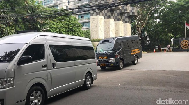 Yang pertama mobil Toyota Hiace berpelat 10012-VII, kemudian disusul mobil hitam dengan tulisan 'Ditreskrimsus Polda Metro Jaya' berpelat 10010-VII.