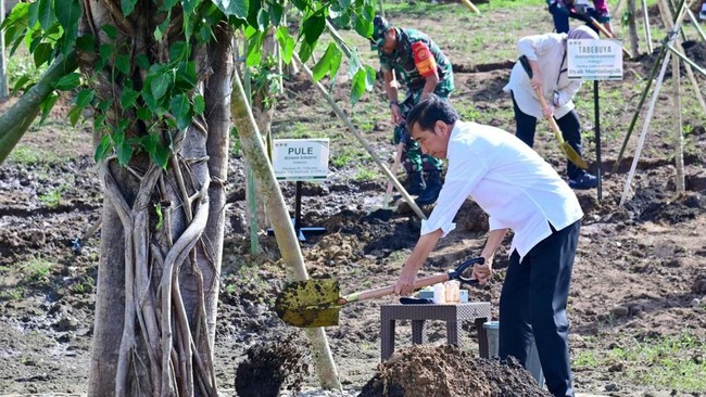 "Tanaman yang ditanam juga tanaman yang banyak tanaman endemik, seperti tadi munting, bodhi, tabebuya, ada mulih, ada ketapang," tutur Jokowi.