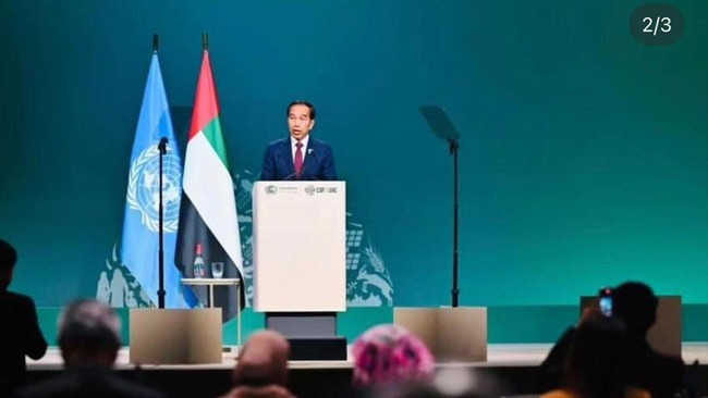 Beredar di media sosial foto yang dinarasikan kalau Presiden Joko Widodo (Jokowi) ditinggal peserta Konferensi Perubahan Iklim atau COP28 di Dubai saat berpidato. Menteri Lingkungan Hidup Siti Nurbaya dan Wakil Menteri Luar Negeri (Wamenlu) Pahala Mansury menepis narasi tersebut.