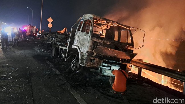 "Beberapa kali terjadi ledakan. Posisi terakhir truk tangki di bahu jalan menghadap ke barat," jelas Kanit PJR Jatim III AKP Imam Syafudin Rodji.
