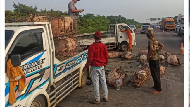 Berikut tiga fakta truk terguling hingga membuat muatan babi tumpah ke jalan: