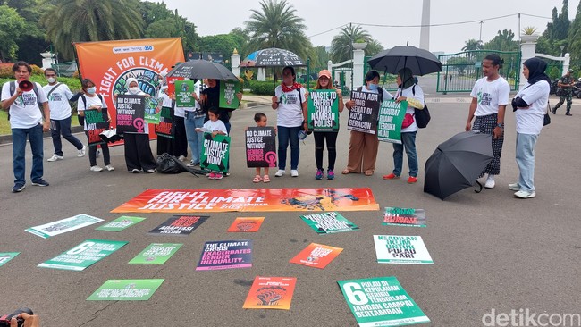 Sejumlah aktivis yang tergabung dalam Koalisi Masyarakat Sipil menggelar aksi bertajuk Serukan Perjuangan Keadilan Iklim di depan Istana Merdeka. Aksi itu merespons kehadiran pemerintah Indonesia dalam acara Conference of the Parties 28 (COP28) di Dubai, Uni Emirat Arab (UEA).