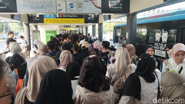 Lalu lintas di sekitaran Kompleks Stadion Utama Gelora Bung Karno (GBK) macet. Terjadi pemumpukan antrean penumpang di Halte Bus Transjakarta.