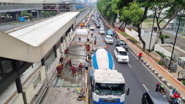 Pantauan detikcom di lokasi, pukul 09.00 WIB, Minggu (10/12/2023), tampak petugas sedang mengerjakan perbaikan jalan. Ada truk molen dan sejumlah peralatan yang digunakan untuk perbaikan jalan.