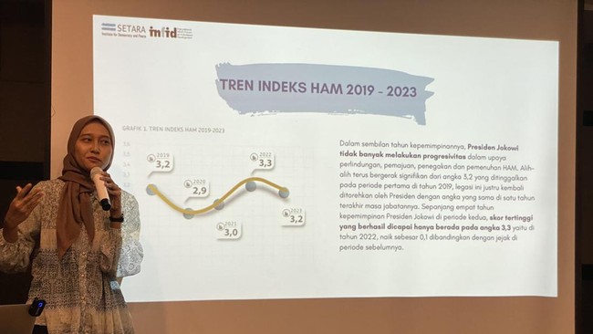 "Jadi terkait dengan indeks HAM ini, sebetulnya kalau boleh kami menyebutkan, memang dari tahun ke tahun trennya itu memang selalu hampir jarang kemudian mencapai angka moderat," kata peneliti hukum dan Konstitusi Setara Institute Sayyidatul Insiyah dalam paparannya di Jakarta Pusat, Minggu (10/12/2023).