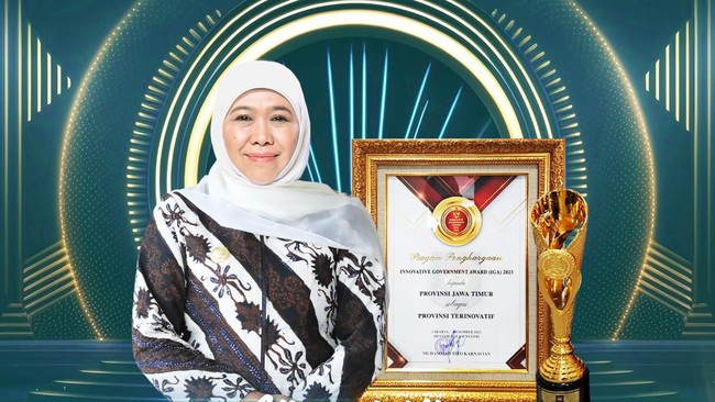 Pemerintah Provinsi Jawa Timur raih penghargaan sebagai Provinsi Terinovatif dalam Innovative Government Award (IGA) Tahun 2023 yang digelar oleh Kementerian Dalam Negeri (Kemendagri). Penghargaan tersebut langsung diberikan oleh Menteri Dalam Negeri (Mendagri) Tito Karnavian kepada Gubernur Khofifah Indar Parawansa yang diwakili oleh Sekretaris Daerah Provinsi Adhy Karyono di Gedung Sasana Bhakti Praja Kemendagri, Jakarta, Selasa (12/12).