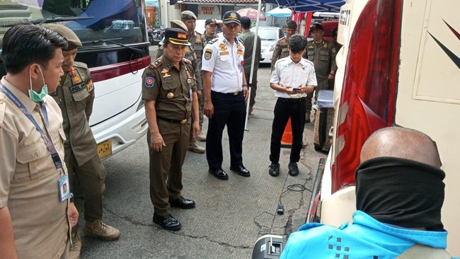 Satpol PP DKI Jakarta menggelar razia uji emisi di Terminal Bus Kalideres dan sekitarnya. Puluhan kendaraan bus, angkot, hingga truk terjaring razia.