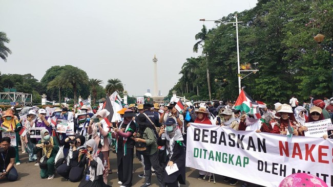 Medical Emergency Rescue Committee atau MER-C bersama berbagai organisasi tenaga kesehatan lainnya menggelar demonstrasi di kawasan Patung Kuda, Jakarta Pusat. Mereka menuntut adanya jaminan bagi keselamatan tenaga kesehatan di Gaza, Palestina.