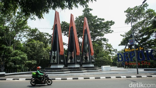Terlihat ada tiga tugu berbentuk segitiga yang berjejer di kiri jalan. Tampak ada juga pelang tulisan 'Welcome To Depok Friendly City' di dekat tugu selamat datang itu.
