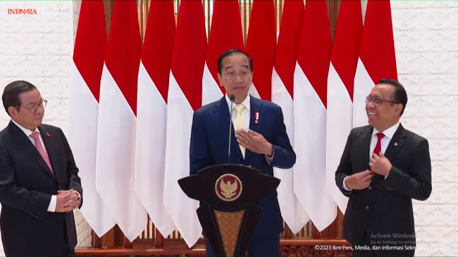 Mendengar pertanyaan itu, Jokowi langsung melihat ke arah dasinya. Pratikno tertawa, sedangkan Pramono Anung tersenyum.